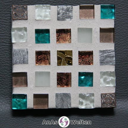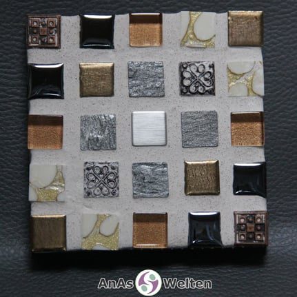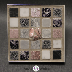 Unsere Variante 2 des Sator-Quadrat-Mosaiks ist mit Alu-Winkeln umrandet und ca. 14 x 14 cm groß.