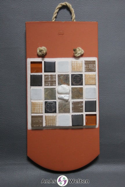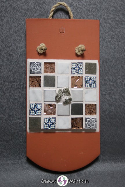 Wir haben ein Seil durch die Löcher der Biberschwanz-Dachziegel geführt, damit Sie das Mosaik bequem aufhängen können. Außerdem ist unterhalb des Mosaiks eine freie Fläche von ca. 5 x 13 cm, die Sie z. B. mit einem Namensschild personalisieren können.