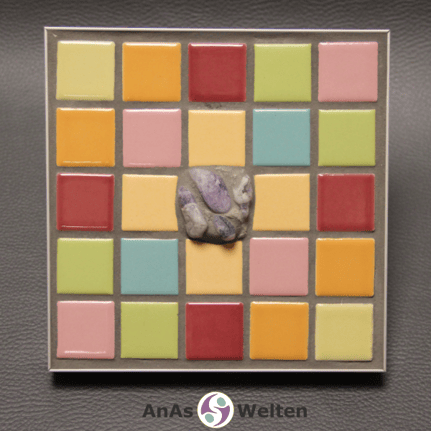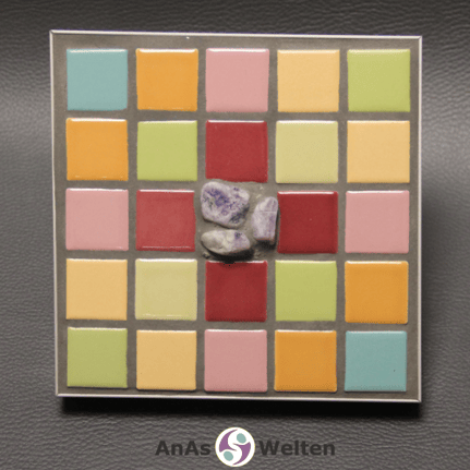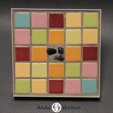 Hier wurden die Buchstaben des Sator-Quadrats auf eine Jackoboardplatte geschrieben und anschließend überfliest. Wie auch bei den anderen Varianten steht je eine Fliesenfarbe für einen eigenen Buchstaben. Auf dem mittleren Buchstaben N haben wir Edelsteine verwendet.