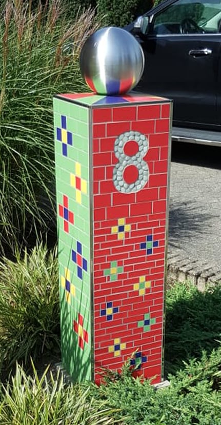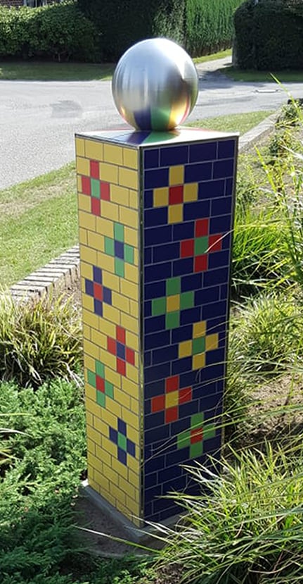 Die im Vorgarten stehende Säule ist ca. 120 cm hoch plus Edelstahlkugel.